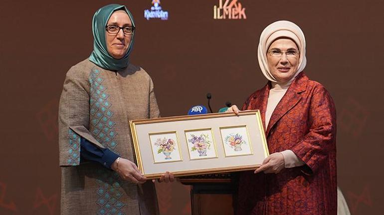 Konuşmaların ardından Saliha Demirer, Emine Erdoğan'a günün anısına etaminle işlenmiş bir tablo hediye etti.